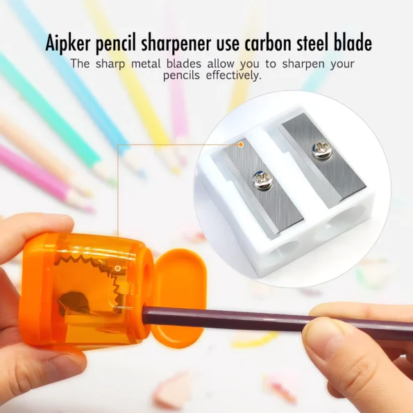 • Portable manual pencil sharpener with dual holes and lid. Ideal for kids and adults in school or office use.